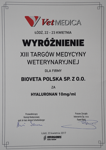 V súťaži o Zlatú medailu VetMedica 2017 udelila Vedecká rada veľtrhu, mimo hlavnej ceny, ešte Zvláštnu cenu, a to našej BIOVETA Polska Sp. z o.o. za produkt HYALURONAN 10 mg/ml, pri ktorom ocenila predovšetkým jeho uplatnenie v liečbe koní, psov a mačiek a predovšetkým dostupnosť tohto produktu na poľskom trhu, kde nie je v súčasnej dobe iný konkurenčný produkt. Pochvalu za starostlivú prípravu tejto dôležitej akcie si zaslúži celý tím poľskej Biovety a obzvlášť DVM Angelika Orlewicz, ktorá prínosy produktu pre veterinárnu prax obhájila pred vedeckou radou veľtrhu a mohla sa tak osobne tešiť z prevzatia ocenenia. Návštevníci veľtrhu neskrývali svoj záujem o čo najrýchlejšiu dostupnosť nielen tohto produktu, ale i mnohých ďalších výrobkov Biovety na poľskom trhu.