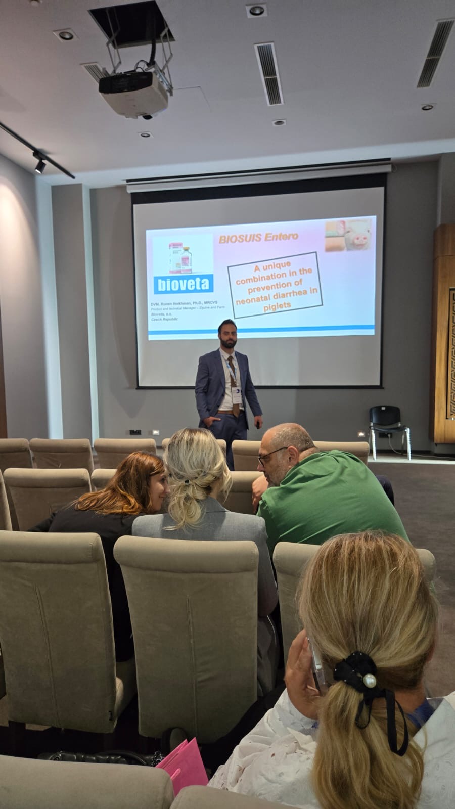MVDr. Ronen Hoikhman, Ph.D., produktový manažér MRCVS, predstavil z praktického hľadiska najúčinnejšie riešenie, a to použitie polyvalentnej vakcíny s unikátnym zložením Biosuis Entero, ktorá imunizáciou prasníc v poslednom období gravidity dokáže preniesť dostatočný titer protilátok na mláďatá, čo znižuje jednak výskyt novorodeneckých hnačiek, ako aj infekčný tlak v stáde prasníc.