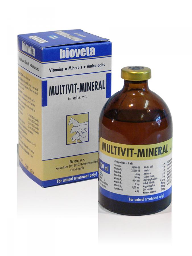 MULTIVIT - MINERAL inj. ad us.vet. sa má používať pri liečbe a prevencii nedostatku vitamínov u koní, oviec, ošípaných, kôz, sliepok, kurčiat, moriek, mladých moriek, kačíc, mladých kačíc, husí, mladých husí, holubov a exotických vtákov pri chorobe a zotavovaní.