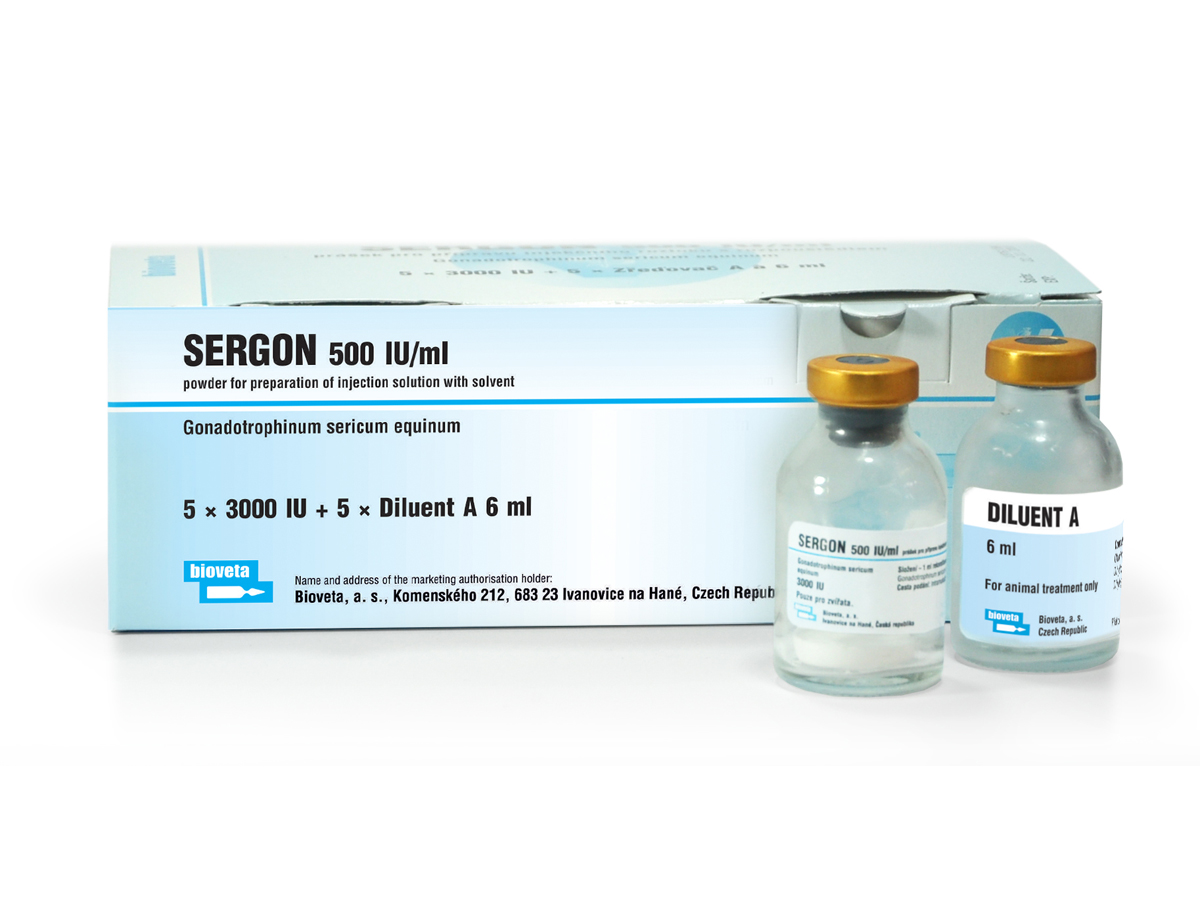 Hlavná stránka Prípravky Veterinárne prípravky SERGON 500 IU/ml prášok na prípravu injekčného roztoku s rozpúšťadlom